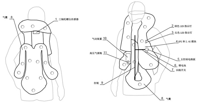 為了防止衣服在未穿戴時觸發氣囊,特意設計了保護系統,拉鏈在未拉狀態,整個系統處于關閉狀態,當拉鏈正常拉好后,系統工作狀態進行自檢,自檢完成后LED綠燈亮起,系統自檢有故障或者電池電量不夠時LED紅燈亮起,整個系統帶有自檢功能。